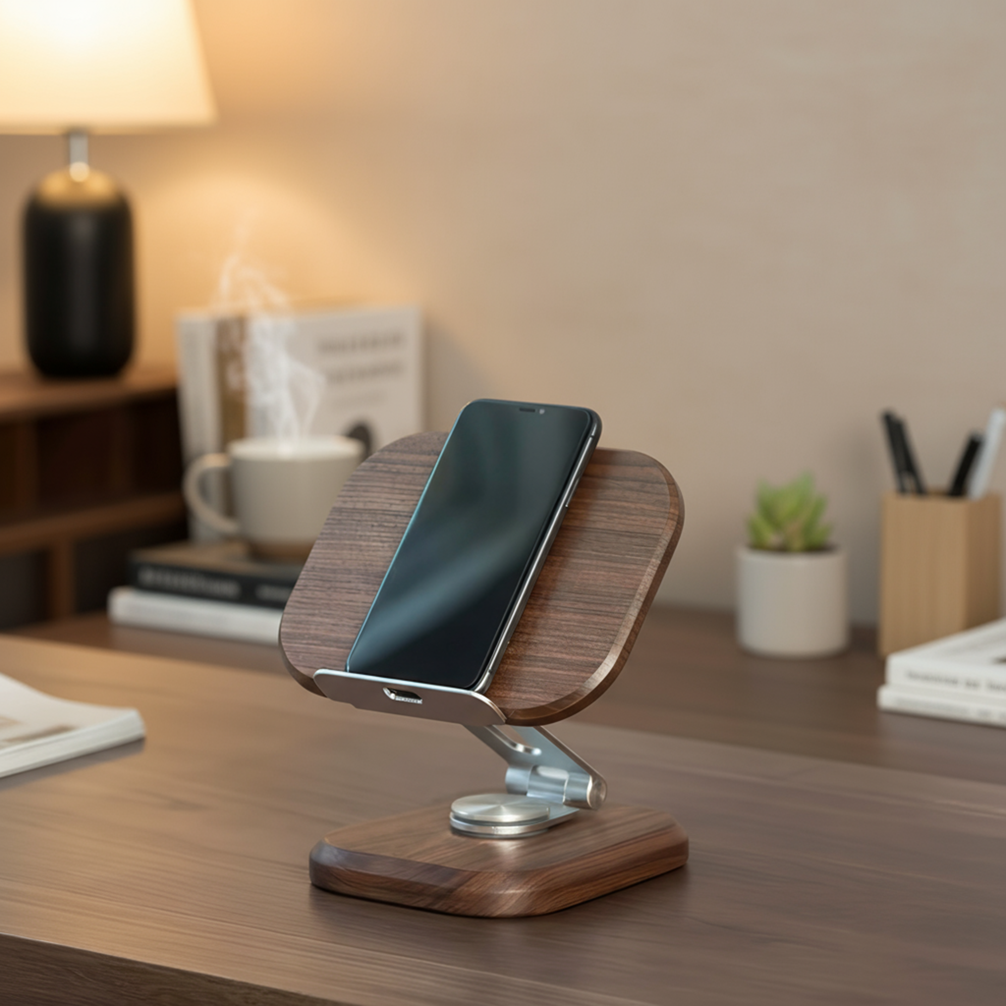 This was designed to fix the problems cheap stands create. Crafted from solid walnut and aluminum alloy, it holds your devices steady without wobble, withstands heat up to 105℃ and daily wear, and rotates 360° for the perfect viewing angle. Foldable, portable, and minimalist in style, it’s the stand that simplifies your setup and elevates your space at the same time.